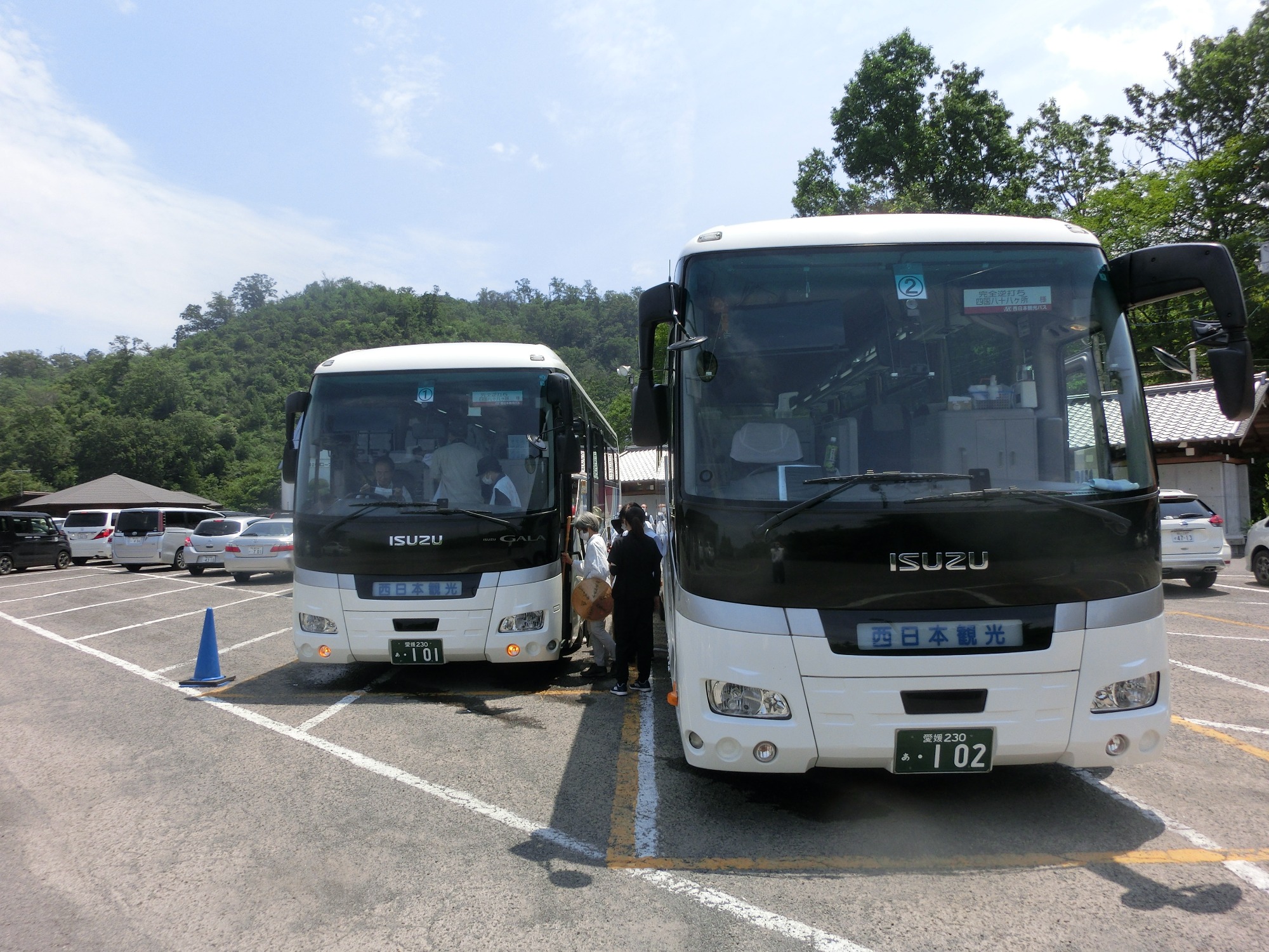 新型車両導入前の「伊予灘ものがたり」、ツアー申込もキャンセル待ちが出るほどの大人気。今日は大型バス2台で行きます。勿論、三密を避けるため。